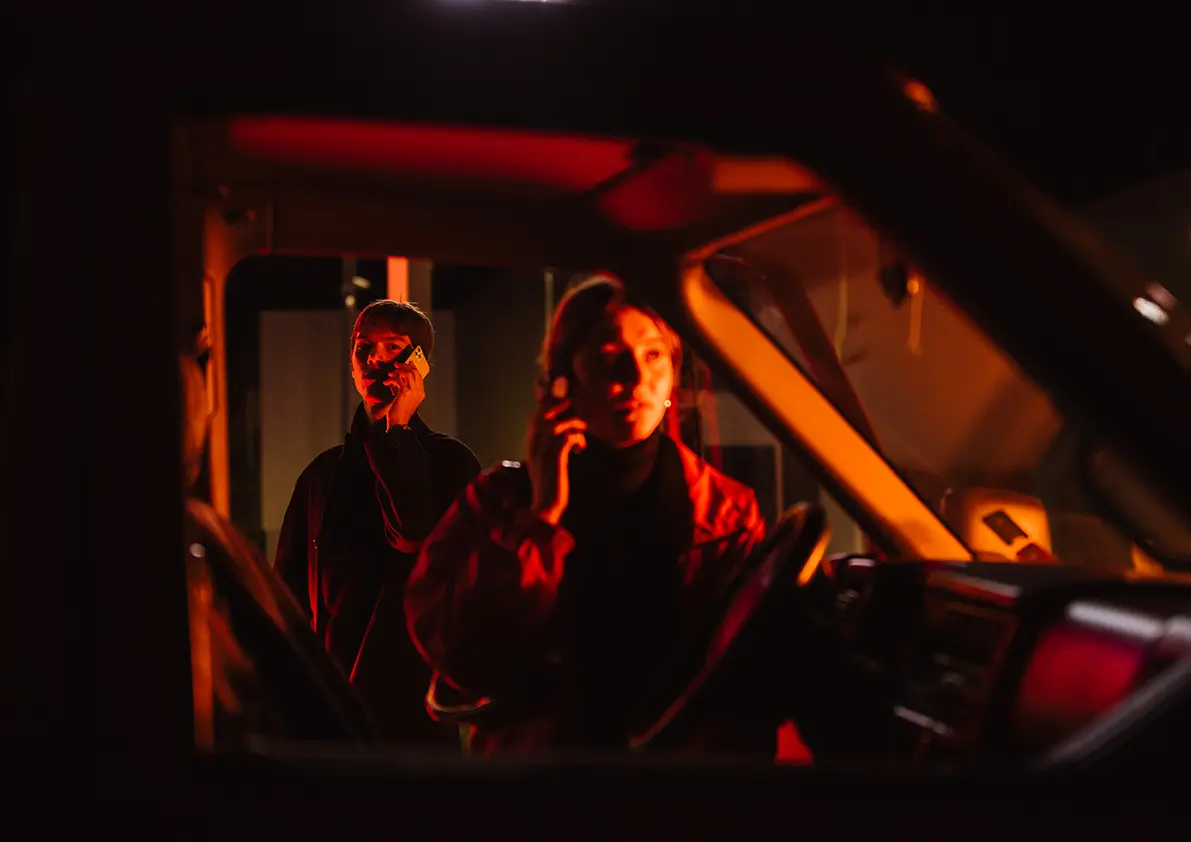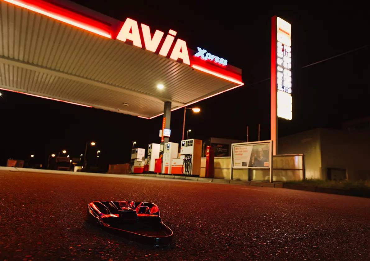 Inspiriert vom Buchzitat entstand eine visuelle Erzählung, die mit Licht und Dunkelheit, Kälte und künstlicher Beleuchtung, Leere und Bedrohung arbeitet. Die gewählte Location, eine Tankstelle bei Nacht, bot mit ihren harten Lichtquellen, dunklen Ecken und der leicht surrealen Szenerie den perfekten Rahmen für eine mysteriöse Bildsprache.